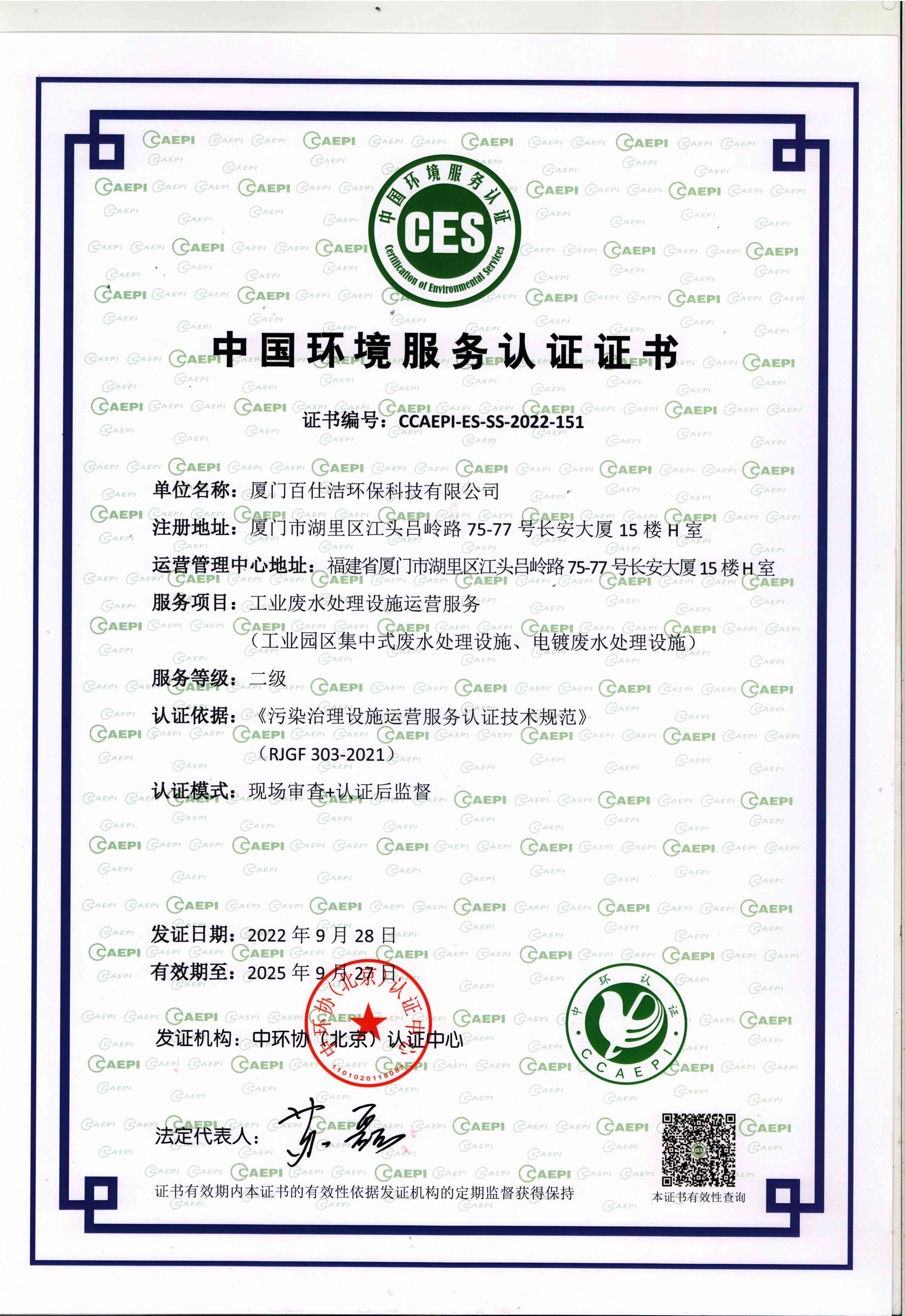中國(guó)環(huán)境服務(wù)認(rèn)證證書(shū)