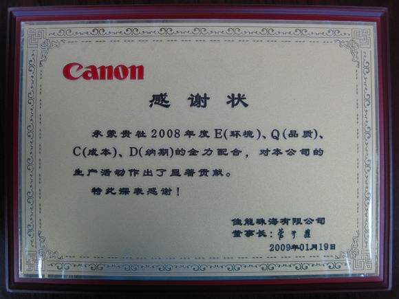 利達(dá)光電榮獲佳能珠海2008年度最佳供應(yīng)商稱(chēng)號(hào)